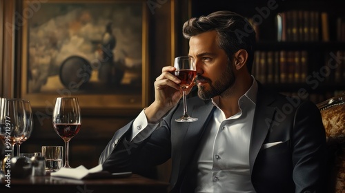 portrait of sommelier in a sophisticated setting, such as a high-end restaurant or private tasting room. The sommelier should be engaged in smelling and tasting an alcoholic bevera