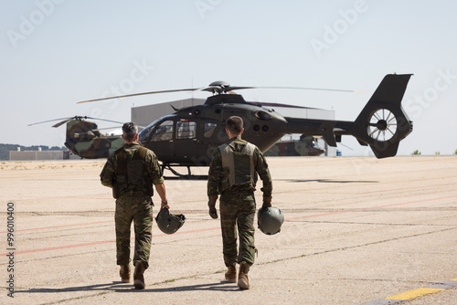 Dos pilotos militares de helicopteros se dirigen hacia sus helicopteros.