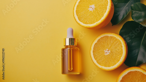 Na tle soczystej pomarańczy, buteleczka serum z witaminą C błyszczy w świetle, obiecując intensywne nawilżenie i blask dla każdej cery.