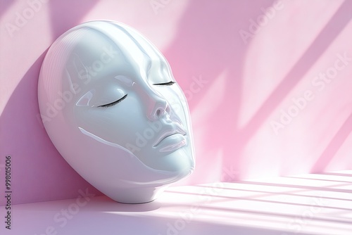 Minimalist art of a white mask leaning on a pink wall symbolizing identity anonymity and the concept of self reflection in modern psychological analysis