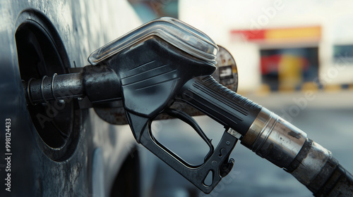 Z bliska widać dyszę pompy na stacji benzynowej, która jest gotowa do napełnienia zbiornika pojazdu.