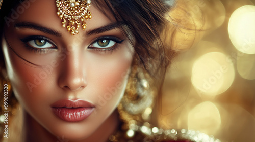 Piękna indyjska kobieta o długich, lśniących włosach spływających po jej ramionach. Jej promienna cera i wyraziste rysy twarzy tworzą harmonijną całość.