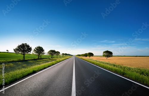 Camino recto en perspectiva en día soleado. Sensación de libertad. Viajes y turismo. Ilustración IA generativa