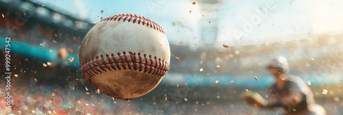 Dynamic baseball pitch captured, soaring ball in focus, blurred batter and catcher engaged in the game, vibrant stadium atmosphere