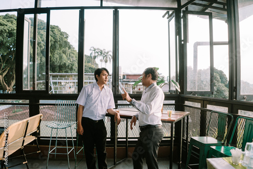 Two Southeast Asian men engaging in an enthusiastic conversation