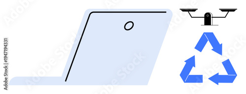 Technology, cybersecurity, surveillance, environmental protection, device recycling, sustainability. A laptop, surveillance camera and recycling symbol. Technology and cybersecurity with a focus on