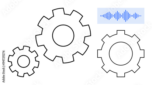 Technology integration. Gear symbols highlight technical processes and system functions. Audio wave suggests multimedia capabilities. For innovation, systems, multimedia, automation, communication