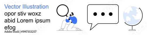 Communication, research, global access, knowledge exchange, virtual networking, information sharing. A person with magnifying glass, speech bubble and globe. Communication and research concept