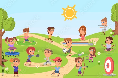 Kids sport activities in park. Sports child, healthy children on playground. Outdoor athletics play, cartoon girl jumping decent vector scene
