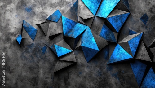 Abstract geometric shapes, dark gray and vibrant blue triangles, textured background