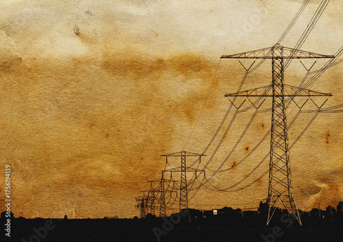 Large textured illustration featuring power cables in a field combined with a vintage paper background