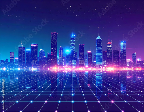 A futuristic, vibrant cityscape at night, with towering skyscrapers reflecting on a glowing, digital grid surface under a starry sky.