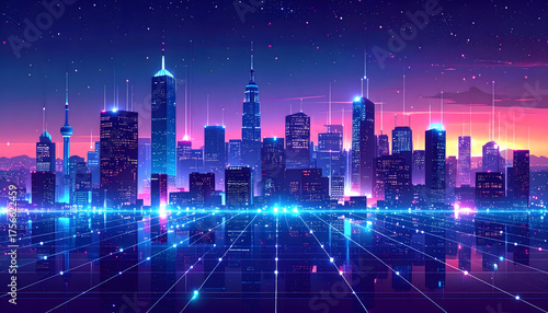 A futuristic, vibrant cityscape at night, with towering skyscrapers reflecting on a glowing, digital grid surface under a starry sky.