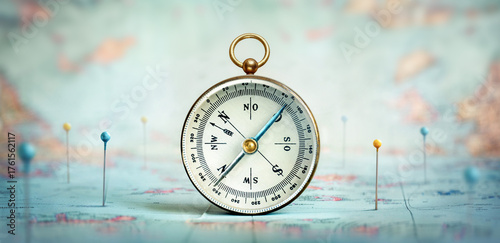 Magnetic old compass on world map.Travel, geography, navigation, tourism and exploration concept background.