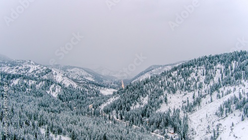 Aerial view of a snow covered winter landscape at dawn