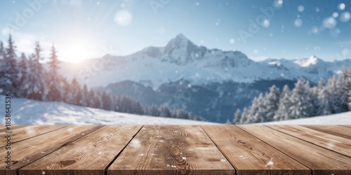 Winter landscape with table setting against Alps backdrop on a sunny day, seasonal change
