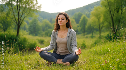 A woman sits cross-legged on grass in a field, eyes closed and hands in a meditative position. Trees and rolling hills fill the background. It is daylight and serene