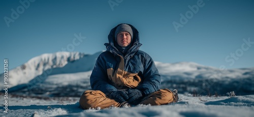 Adventurer man sitting on snow contemplating cold mountain landscape. Man in winter gear sitting on snow looking at snowy mountains under clear sky
