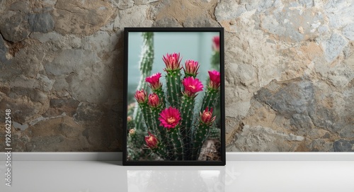 Sleek cactus plant in black frame against white floor and rugged stone wall background