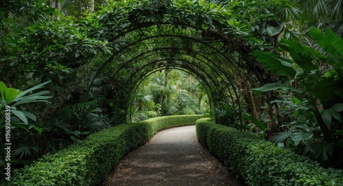 Tranquil botanical garden path under lush green foliage arch