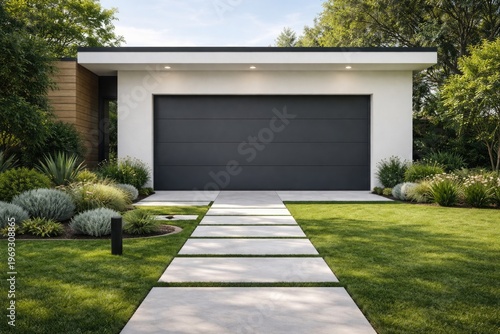 modern garage door entrance with white stone pathway and lush green lawn