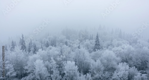 Winter forest panorama filled with thick snowy fog and frozen trees