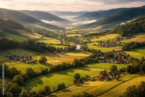 Aerial View of Lush Countryside Valley with Rolling Hills and Fields