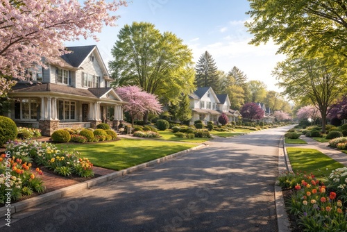 Sunny spring suburban neighborhood with spacious homes and well kept gardens