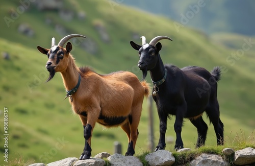 Two goats, one brown and one black, stand on rocks in a grassy mountain meadow. They have horns and wear collars. Sunny day, rural landscape with green hills.