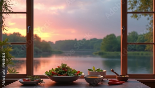 Fresh salad with tomatoes and herbs sits on table near lake. Open window shows serene sunset sky and trees. Peaceful home meal with nature view.