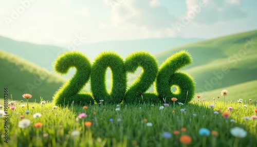 Green grass numbers 2026 form text on sunny spring meadow with blooming wildflowers. Rich rolling hills form backdrop under clear blue sky. Natural scenery suggests new beginnings and eco growth.
