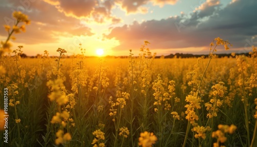 Yellow rapeseed flowers bloom in vast field during warm sunset. Golden hour light creates beauty over rural farmland. Summer agriculture scene glows warmly.