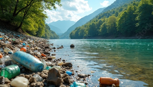 Plastic bottles, rubbish litter rocky riverbank with lush green trees, mountains in background. Water pollution harms natural scenic beauty, wildlife habitat. Urgent need for cleanup, eco awareness.