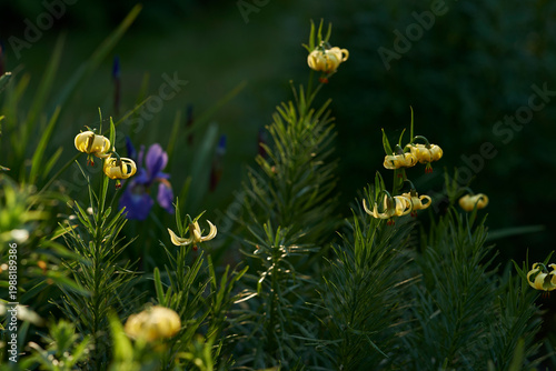 Nature, countryside and flowers in garden for ecology, blossom and botany in backyard. Pyrenean lily, background and morning with petals, bush and floral plant for environment, outdoor or growth