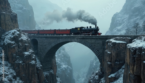 Vintage steam engine train crosses stone bridge over snowy canyon. Locomotive travels through misty mountains. Dramatic winter landscape with dramatic atmospheric mood and old railway.