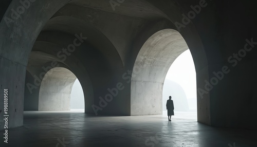 Single person walks through vast concrete arches, minimalist brutalist architecture interior. Futuristic passage leads to bright foggy landscape. Person wears long coat and shoes.