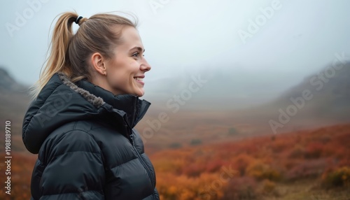 Blonde woman smiles in black puffer jacket amid Iceland autumn landscape. Foggy mountains and orange fields create a serene, cold, travel backdrop. Outfit suits outdoor adventure lifestyle.