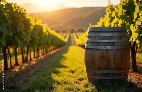 Wooden barrel sits in vineyard rows during golden hour sunset. Lush green grape vines stretch into background, hills slope gently. Autumn harvest anticipation scene.