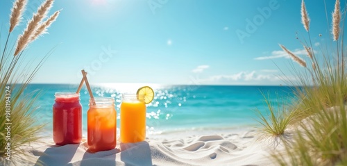 Three colorful fruit drinks in glass jars sit on white sand beach. Bright blue ocean water and clear sky form background. Tall beach grass frames the scene.