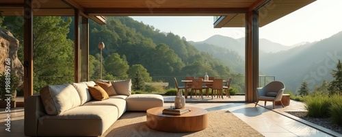 Modern living room with large windows frames lush green mountain panorama. Comfortable sectional sofa faces wooden dining set on deck. Serene nature retreat offers quiet, expansive views.