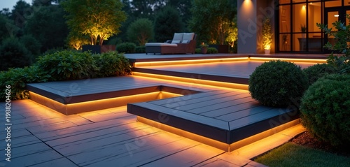 Modern multilevel deck with ambient orange lighting. Rich green bushes and trees surround the patio. Outdoor lounge furniture is visible. Stylish backyard.