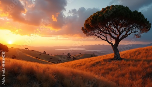 Lone araucaria tree on rolling hill landscape at sunset with orange clouds. Golden grass field, distant lake and mountain range visible in warm evening light.
