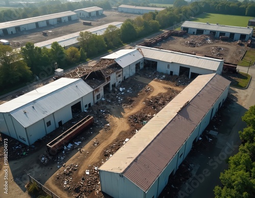 Aerial view shows industrial complex with damaged buildings after severe storm. Debris litters the ground around warehouse structures. Some roofs are partially collapsed.
