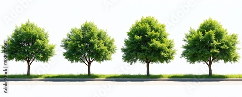 Line of green leafy trees with clear cutouts on white background. Four diverse deciduous trees with grass and pavement edge. Perfect for nature design elements or urban greening projects.