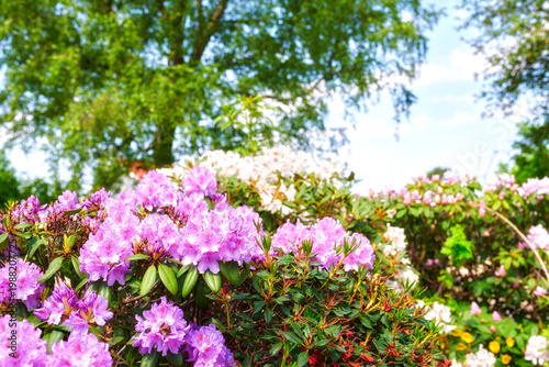 Spring, flowers and trees in garden with leaves, texture and floral bloom for sustainable environment. Growth, rhododendron plants and purple petals in backyard with green foliage, botany or outdoor.