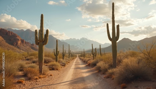 Dirt road leads through arid desert landscape lined with saguaro cacti and dry brush. Mountains rise in background under a blue cloudy sky. Warm sunlight bathes the scenery.