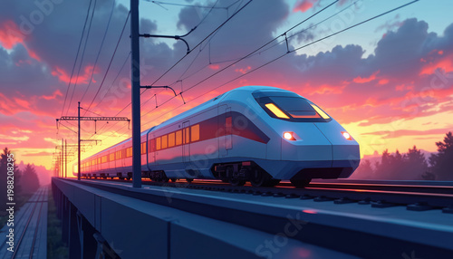Modern high speed train travels on railroad tracks during vibrant sunset sky. The fast passenger train moves along a bridge over trees with colorful clouds in background.