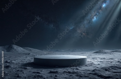 Minimalist podium on moon surface below starry galaxy. Empty stage displays product on lunar landscape. Cosmic background with light beams from above.