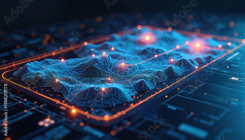 Digital 3D terrain map with glowing contour lines. Navigation path shows connection points on abstract landscape. Futuristic UI screen displays topographical data.