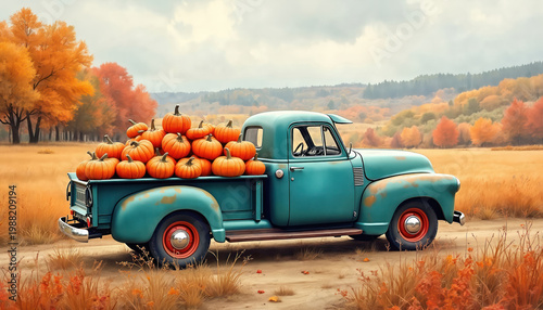 Teal vintage truck carries pile of pumpkins. Colorful autumn trees line rural farm road. Fall harvest scene with bounty vegetables and golden fields.
